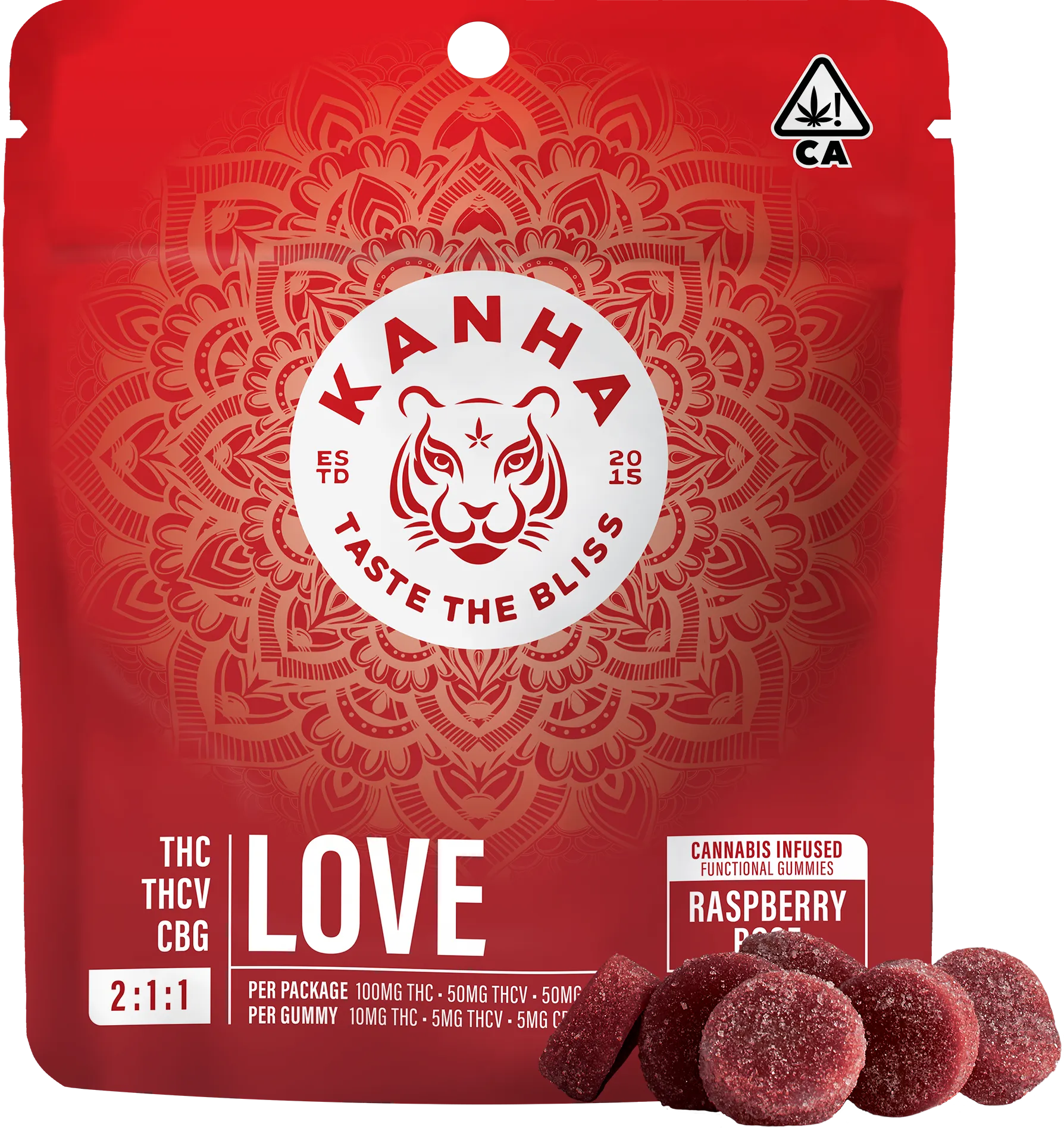 Our LOVE gummy combines the delicious flavors of Raspberry and Rose with a perfectly formulated 2:1:1 threesome of THC, CBG and THCV. Enhanced with Damiana extract which may improve blood flow and stamina, experience deep euphoria and amplified arousal in every bite.